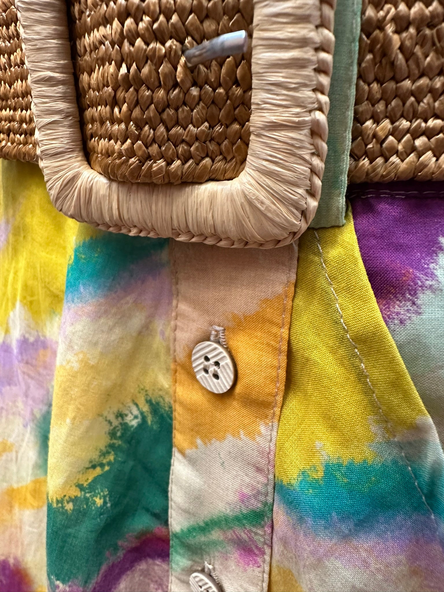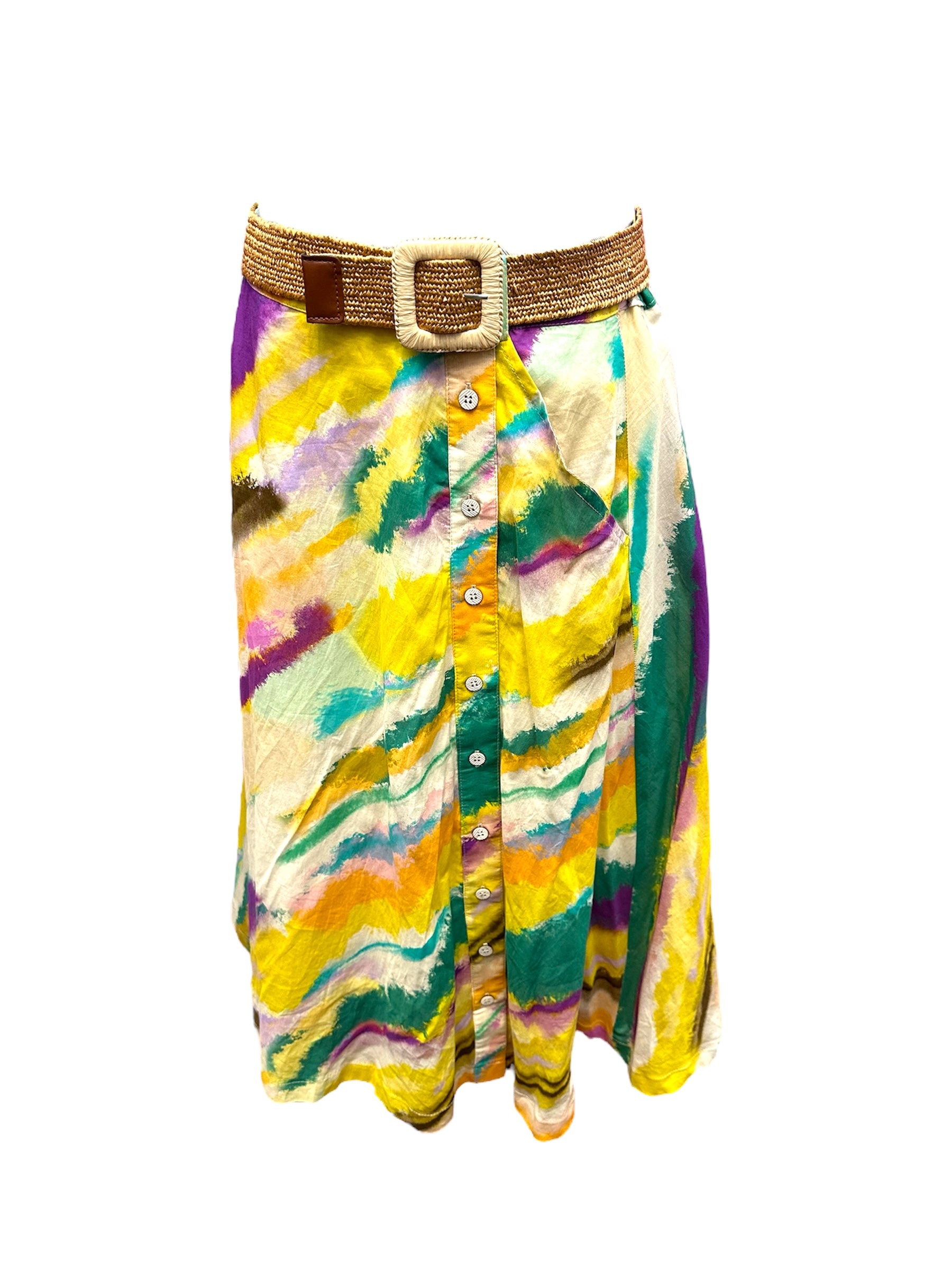 Jupe La Petite Française, été 2024, voile de coton, boutonnée, évasée, ceinture amovible, façon tie and dye